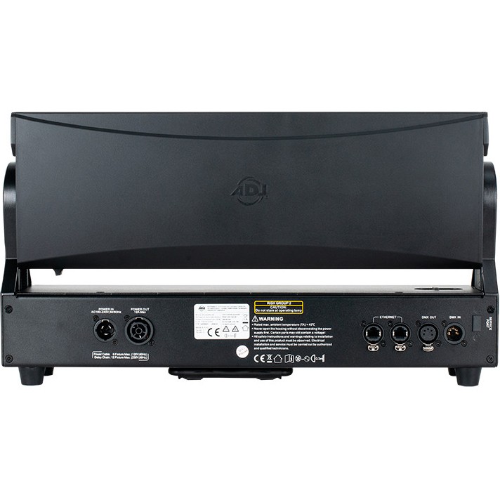 The Allegro Z6 has a 4-button function display, 5-pin DMX In/Out to link data and locking power connectors to daisy chain power. The fixture also has RJ45 In/Out connections for Art-Net and Kling-Net control. There is a convenient USB input for updating the fixture's firmware.