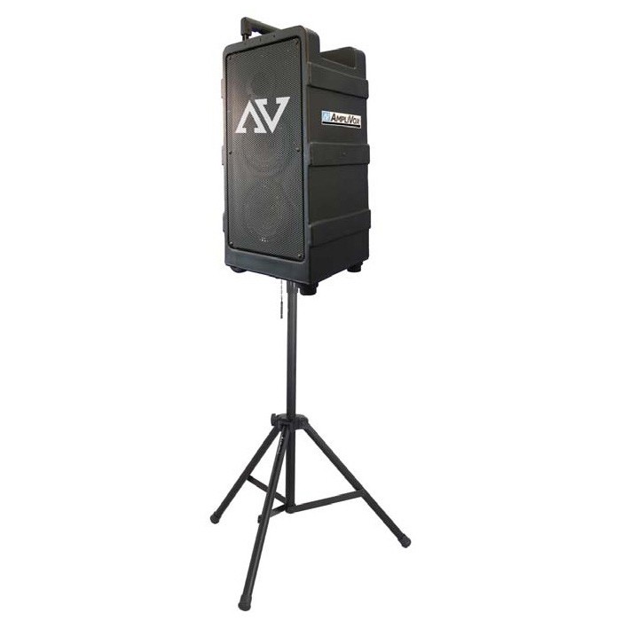 The AmpliVox S1297 wireless powered dual speaker has a built-in receiver and 250 watt amp that drives two 6 in. NEO woofers and a dynamic compression tweeter. This all comes in a molded plastic case with a retractable luggage handle, wheels, and built-in tripod mount. It is powered by AC or rechargeable internal batteries.