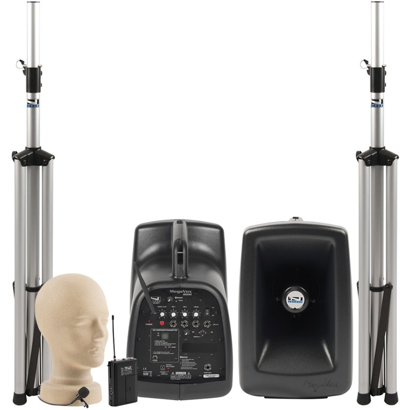 The Anchor Audio MegaVox Deluxe AIR package includes a MegaVox MEGA-8000XU1 speaker with built-in Bluetooth, MegaVox MEGA-AIR battery-powered wireless companion speaker, a wireless lapel microphone and two SS-550 heavy-duty speaker stands. The MegaVox Pro PA system comes equipped with a built-in Bluetooth, AIR wireless companion transmitter and a wireless receiver. With a powerful and high-efficiency re-entrant horn driver, the system can deliver clear 119 dB sound up to 200 yards. Each speaker unit is powered by a built-in rechargeable battery that is capable of running for up to 6 to 8 hours on a single charge.