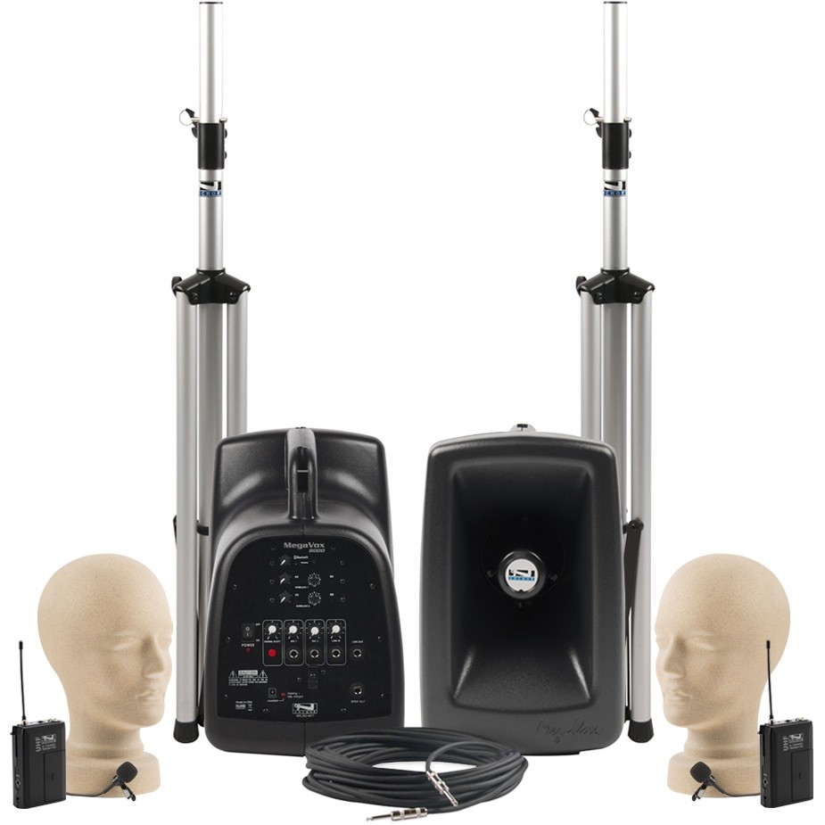 The Anchor Audio MEGA-DPDUAL MegaVox deluxe dual package includes a MegaVox MEGA-8000U2 speaker with built-in Bluetooth and two wireless receivers, MegaVox MEGA-8001 unpowered companion speaker, two wireless lapel microphones, two SS-550 speaker stands, and a removable shoulder strap. With a powerful and high-efficiency re-entrant horn driver, this two speaker system will reach a crowd of 2,000 or more. Each speaker unit is powered by a built-in rechargeable battery that is capable of running for up to 6 to 8 hours on a single charge.