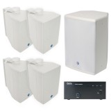 The Atlas Sound APAKSMS Amplifier and Surface Mount Speaker Package System consists of a strategy PA601 amplifier, four SM42T ceiling speakers and one SM8SUB70 subwoofer.