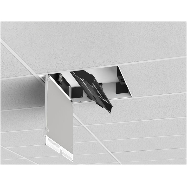The CR222-NR ceiling-mounted equipment rack allows electronic equipment to be conveniently installed out of sight, in the ceiling plenum. The CR Series provides a space-saving solution while also being aesthetically discrete, blending in with common drop-ceiling tile designs. They permit equipment to be securely mounted above the ceiling in a sealed UL plenum-rated cabinet with an easy access door. The door assembly has an open frame design so the installer can place a ceiling tile into the frame and better conceal the entire ceiling rack. The ceiling tile cut-out is safely held in place by retainer tabs, locking it to the frame. To open the door, two retention thumb screws can be removed, and the door has attached safety cables to protect against injury.