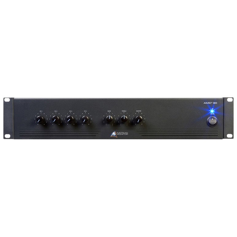 The Australian Monitor AMC+30 Mixer Amplifier takes the rugged reliability of Australian Monitor products and delivers the same high quality audio reinforcement, in a low cost, 2 rack unit package. The AMC+30 has 4 XLR microphone and dual RCA line inputs with input 1 having priority over inputs 2-4 (defeat able) and global 12VDC phantom power.