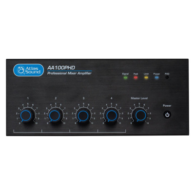 The Atlas Sound AA100PHD 100 Watt Mixer Amplifier is the perfect choice for distributed business paging and background music (BGM) systems, small to medium speech privacy systems, and in applications where music on hold (MOH) plus paging is required.