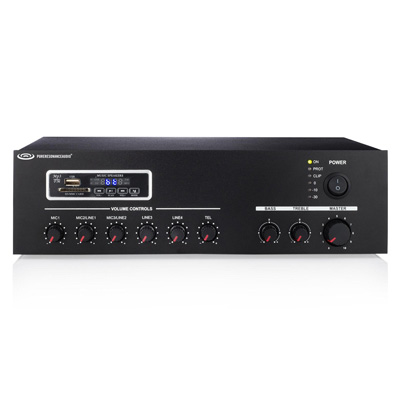 This mixer-amplifier with built-in 100V/70V transformer technology provides a simple to operate and reliable 5-input solution with a built in Bluetooth media player for installation in commercial applications.