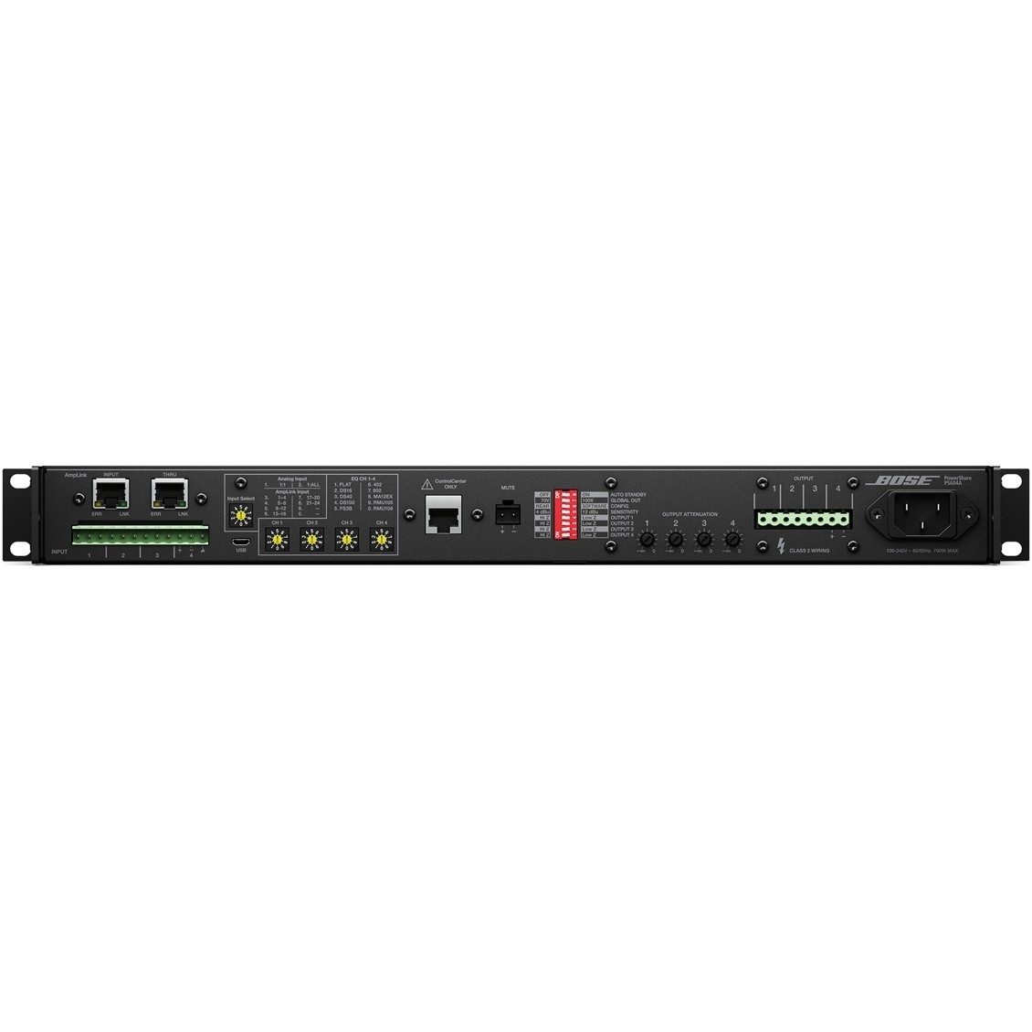 - Integrated Loudspeaker Processing with Optional PowerShare Editor Configuration – For applications requiring additional signal processing the PowerShare Editor Software offers real-time selection and control of Bose loudspeaker EQs, 9-band PEQs, matrix mixing, crossover, delay, and mute/output polarity through a USB connection. For basic setups without a PC, rear-panel settings allow installers to recall Bose loudspeaker equalization and protection per output channel. These features eliminate the need for an external signal processor in many applications