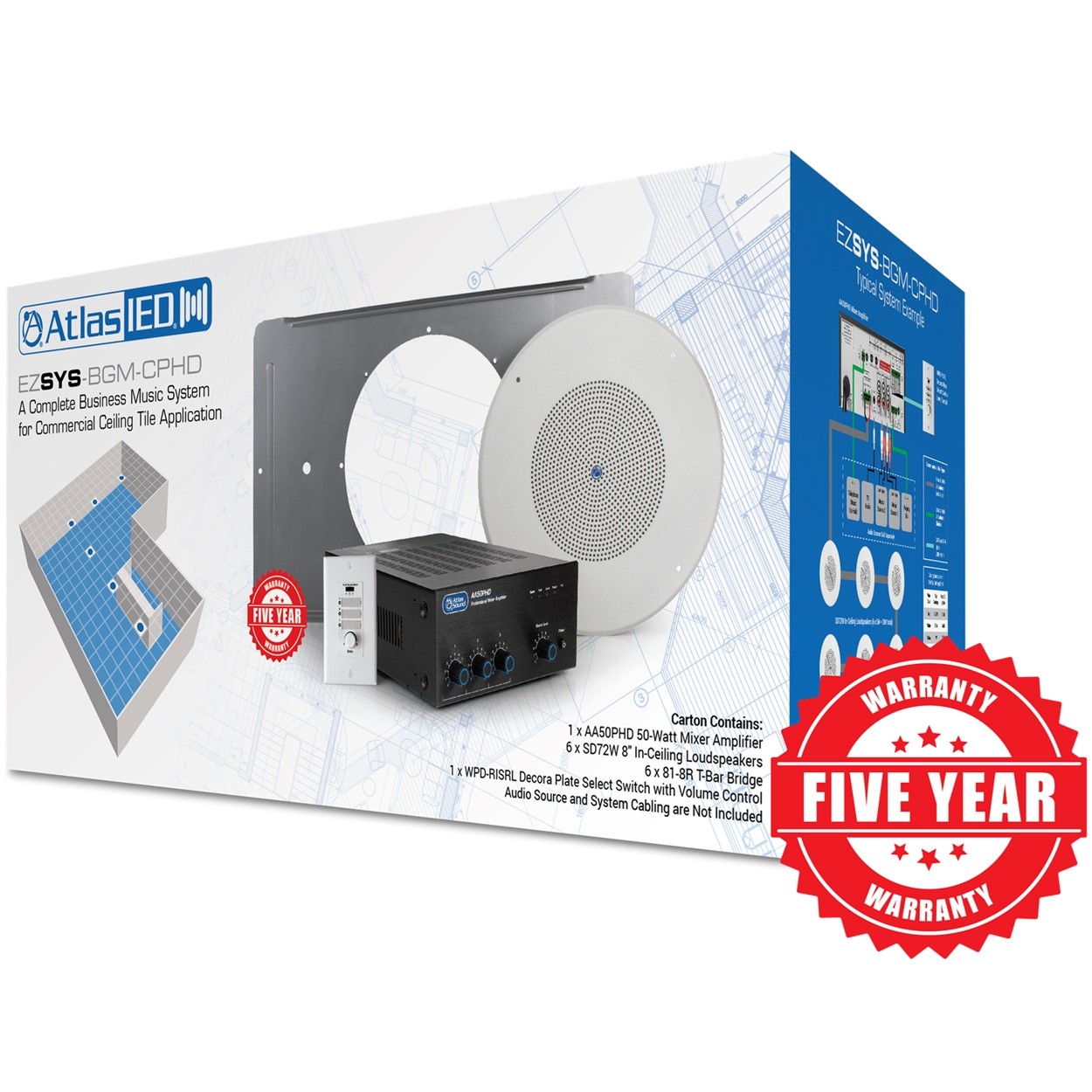 AtlasIED has packaged the most common business music, paging, and sound masking systems into single cartons. No loose parts. Sized and weight optimized for common freight carrier requirements. The EZSYS packages take the guesswork out of your system design and order process. Now, you know which mixer amplifier and loudspeakers seamlessly work together for the most common small-to-medium business music, paging, and sound masking installations.