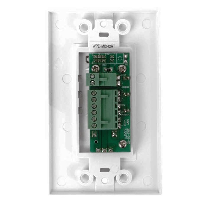 The WPD-RISRL is a decor style wall plate that is designed for use with the AA50PHD mixer amplifier to use the remote input selection (RIS) feature. The WPD-RISRL features an audio source slide selector as well as a source volume control. The unit includes an LED indicator to indicate which source is selected and if it is active. The unit fits in a single gang electrical outlet and uses an 8-conductor interface connection that includes a single 4 position removable Phoenix connector and dual 2 position Phoenix style connectors. When connected to the RIS output on an appropriate AAPHD amplifier, the WPD-RISRL allows for remote selection and volume adjustment of inputs 2, 3, and 4 allowing the rack to remain locked and secured.