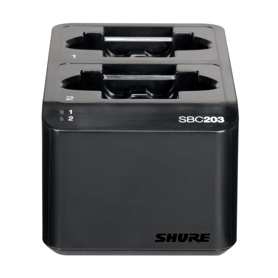 The SBC203 dual docking recharging station charges two SB903 lithium-ion batteries in or out of their transmitters. Built to charge two batteries, two body pack transmitters, two handheld transmitters or any pairing of two SLX-D transmitters or SB903 batteries.