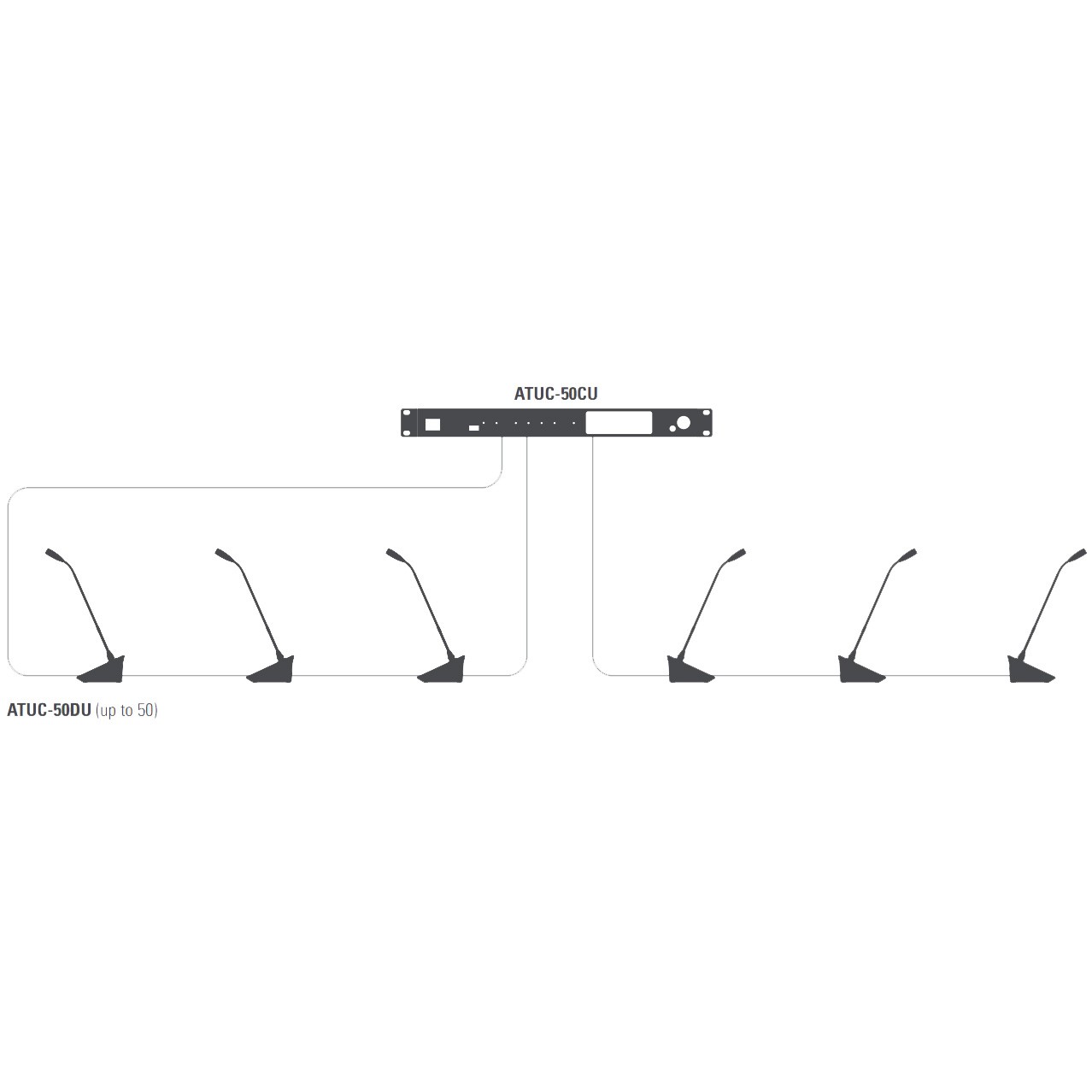 - Up to 50 ATUC-50DU discussion units can be connected, in either daisy chain or ring topology, to each ATUC-50CU control unit