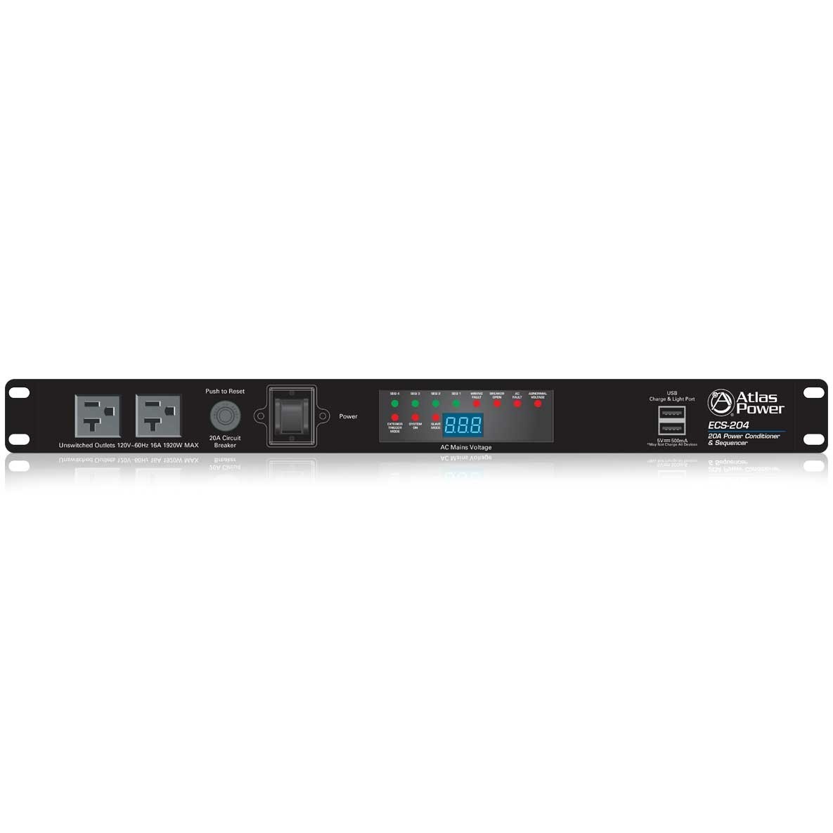 The AtlasIED ECS-204 power conditioner and sequencer ensures stable AC power distribution and protection for all connected equipment. With four timing sections, remote activation capability, and a precision digital voltmeter, it simplifies system startup and shutdown while preventing power surges. Dual front USB charge ports and optional gooseneck lighting support add extra convenience in rack-mounted applications.