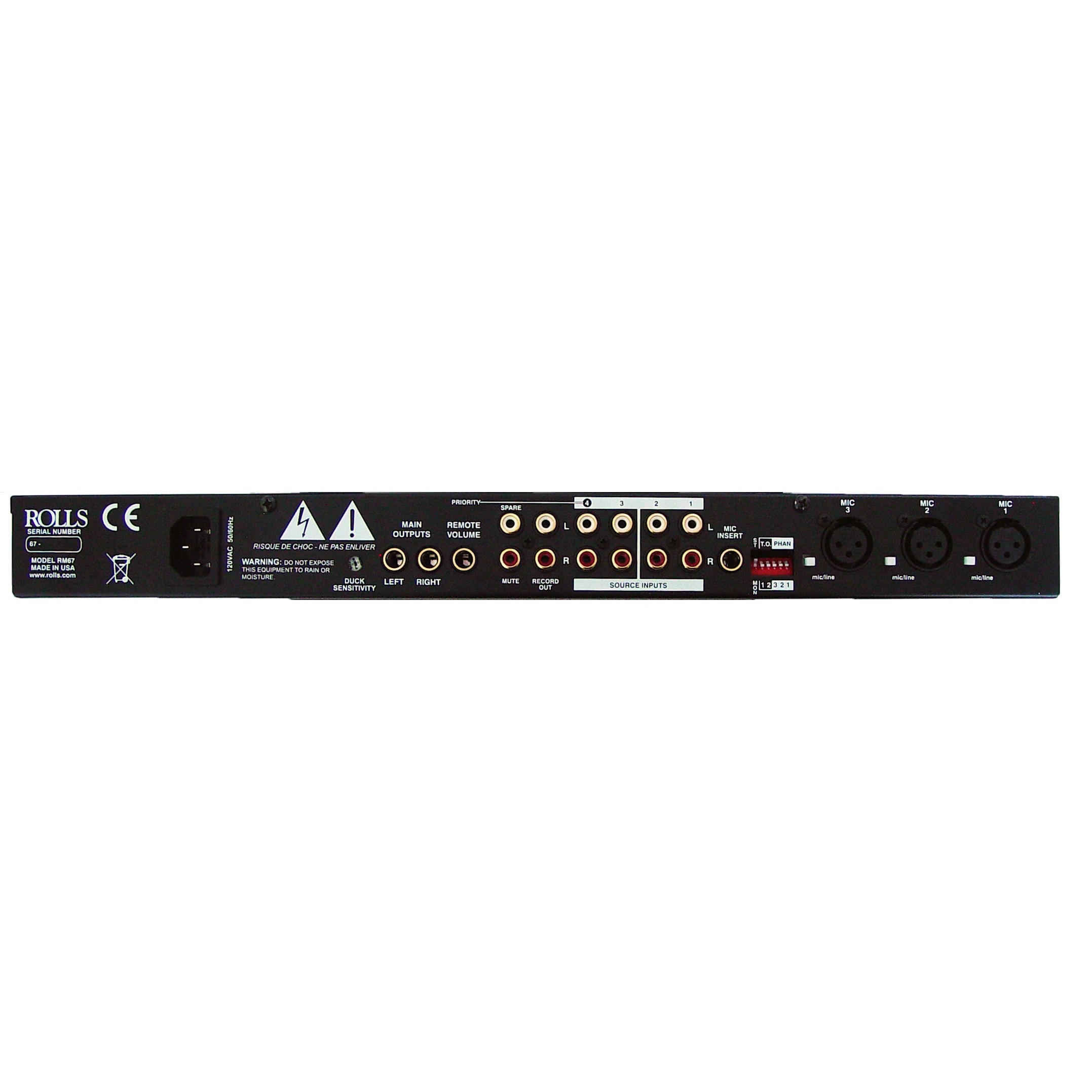 The Rolls RM67 is a single rack space mixer designed for the install/contractor market. The unit mixes three balanced microphones with four stereo sources to mono or stereo balanced outputs. The XLR Microphone Inputs have Mic/Line level switches, a send/return Insert jack, and individually switchable +12 VDC phantom power. Priority talkover, with variable Duck Sensitivity is available on one microphone for paging, and on one Source input for use on a jukebox. telephone system, etc. Each Microphone input has a level and tone control, and each Source input has a level control. Bass and Treble controls have been provided for all the sources, and a Master Output Level control adjusts the level of all mixed signals. Source One has an added front-panel 3.5mm input. A pre-Master RCA output has been provided for recording, and a Remote Volume output jack is provided for connection to a 100K ohm linear taper potentiometer and used as an external master level control.