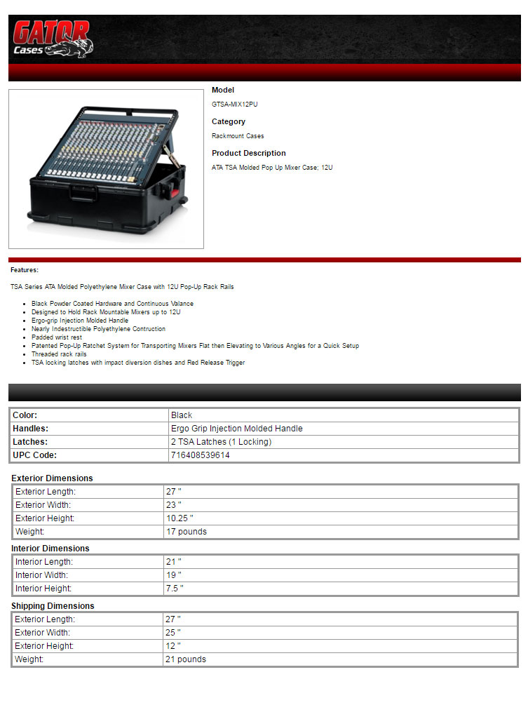 The Gator GTSA-Mix 12PU is both a rack system and a rugged ATA flight case all-in-one. You can mount up to 12U mixer within, throw it in a van or check it in at an airport and when you're ready, set it up at any venue in just seconds. It features rack rails that ratchet upwards and allows you to position the knobs and faders where you need them. Alternatively, if you have a mixer that's smaller than 12U, use the leftover space to mount a headphone amp, outboard FX, recording interface, or power conditioner and leave everything routed for a turnkey live and recording setup. Best of all, the GTSA-Mix 12PU is built tough to keep your gear safe wherever you go.