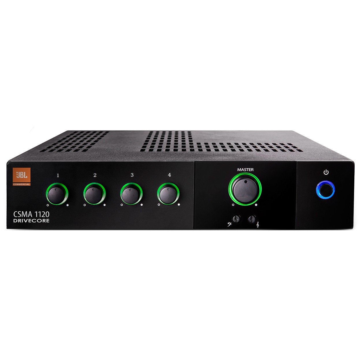 All volume controls on the CSMA 1120 are surrounded by an illuminated ring, making them easy to see and operate in darkened environments. The amplifier can drive 8 ohm and 4 ohm loads and can be used with 70V and 100V distributed audio systems without the need for a separate transformer. In addition to balanced mic/line inputs, unbalanced RCA inputs and speaker connections, all units include RJ45 connectors for use with JBL CSR-V in-wall volume controls. This model feature a universal power supply which enables the ability to accept AC voltages from 100 to 240 VAC, 50/60Hz.- Features
