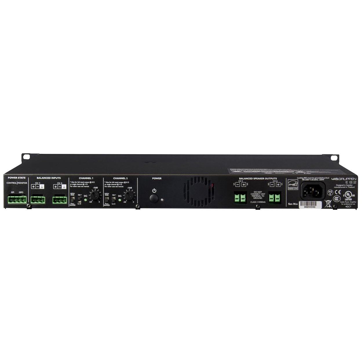 Building on Lab.gruppen’s touring reputation for sonic excellence and rock-solid durability, E Series brings a competitive edge to the installation market by adding ultra-compact size, high operating efficiency, output configuration flexibility, and an unprecedented cost-benefit ratio. At the heart of E Series is IDEEA (IntelliDrive Energy Efficient Amplifier) technology. Based around a patented Class D output stage, IDEEA produces high power levels with very low distortion while drawing minimal mains current.E Series also introduces a proprietary Rail Sensing Limiter (RSLTM) which greatly reduces signal clipping, ensuring high quality audio output at all times, with user configurable output thresholds of either Hi-Z (70 V) or Lo-Z (56.6 V peak). The highly innovative RSL switch circuit senses rail voltages and optimizes output for instantaneous load conditions. RSL settings also facilitate asymmetric loading of the channels, to optimize performance and efficiency from each individual unit - allowing the total available output power to be utilized unequally between the channels, and even allowing for mono use, with all power on a single channel. This makes it possible, for example, to drive a small sub on one channel and a number of 70 V distributed ceiling loudspeakers on the other.