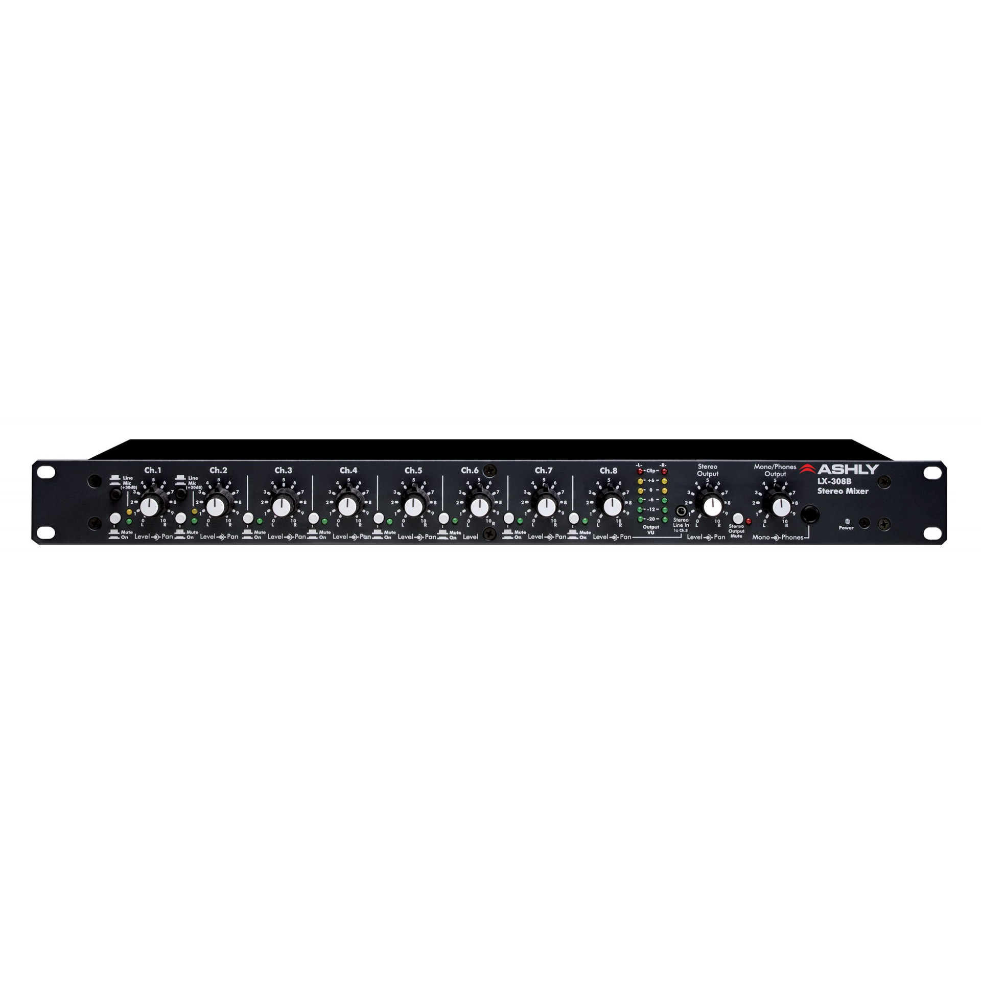 The LX-308B provides precise line-level mixing control in a single space rack-mountable package. Rugged, versatile, and backed by Ashly's exclusive Five Year Worry-Free Warranty, the LX-308B will provide years of reliable performance in applications demanding the very finest in professional audio quality.