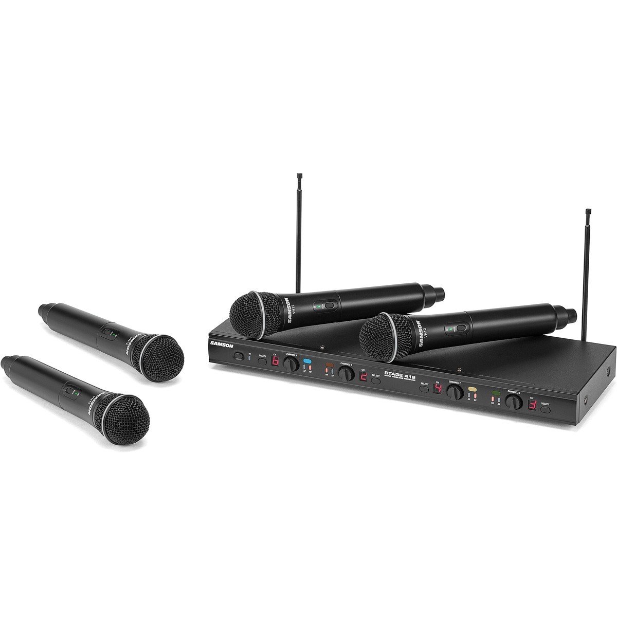 The Samson Stage 412 is a frequency-agile, quad-channel wireless microphone system with four handheld dynamic microphones that transmit to a single rugged metal receiver. Each handheld features Samson's Q6 dynamic mic element, providing crisp, clear sound and reliable VHF wireless performance for presentation, education, house of worship, karaoke and other applications with up to four performers. The Stage 412's frequency-agile design offers four channels with six operating frequencies per channel across a 173MHz - 198MHz frequency range. In addition, the system's IR sync function allows users to wirelessly match each transmitter to a receiver's operating frequency. Each transmitter offers a 200' operating range for up to 10 hours via two AA batteries (not included).