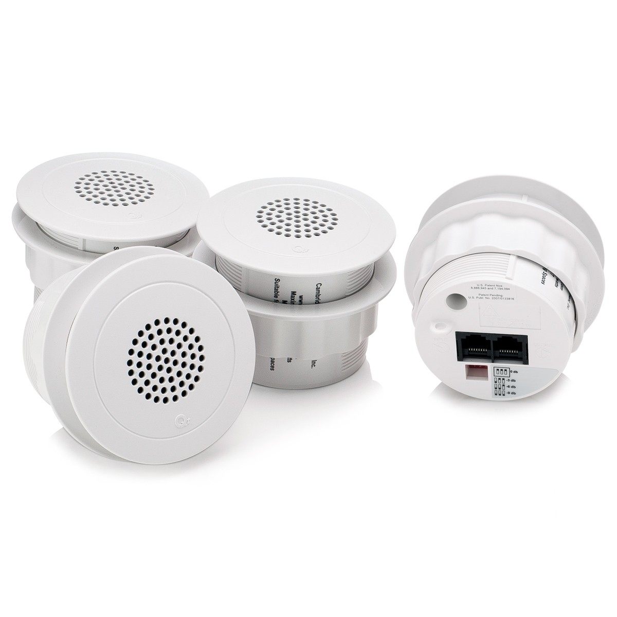 This Qt Patient Privacy System consists of a control module, two lighted privacy signs, and 12 direct-field sound masking emitters. The intuitive control module can be installed in a reception area, in the nurses' station, or mounted to any wall. Once turned on, the emitters installed in the ceiling add a low level of background sound into the space that will make human speech less intelligible. Lighted privacy signs turn on to indicate the system is running, and let patients know that their conversations are being protected.