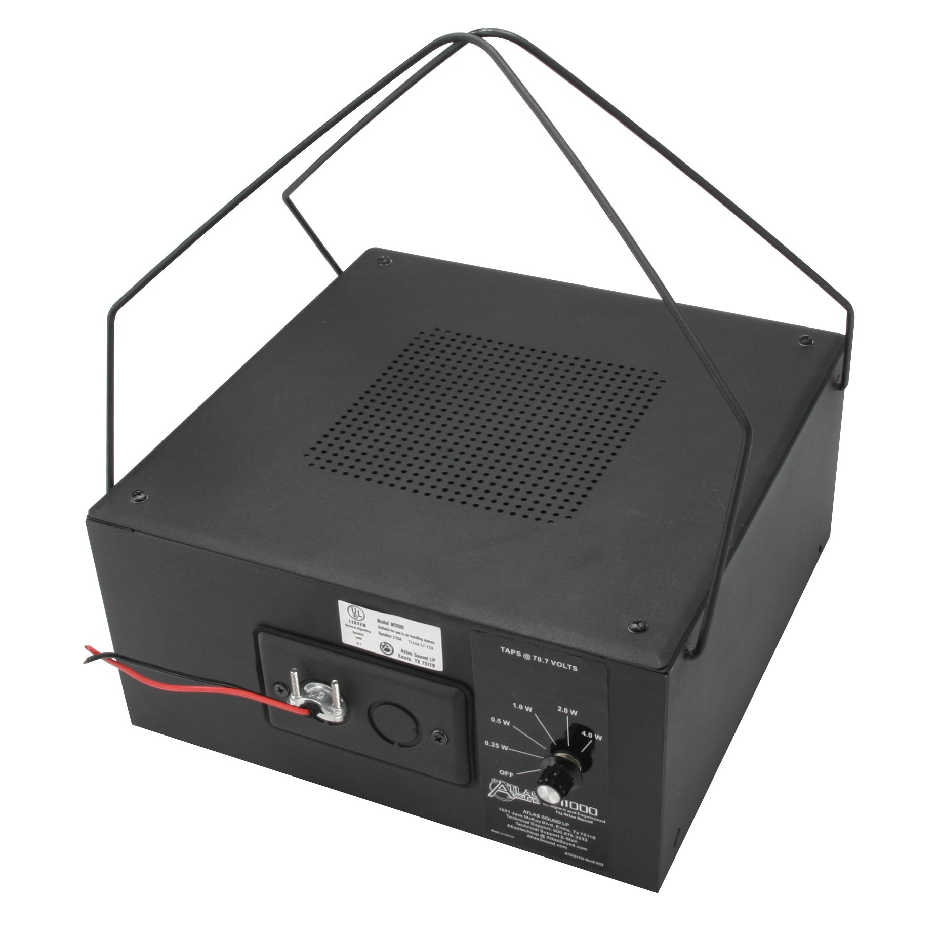 The exclusive Atlas Sound EZ hang brackets simplify installation. This innovative suspension system utilizes (2) collapsible plated hangers configured to allow quick upward, downward, or side firing installation. The hangers are factory-installed on the unit and fold flat for shipping. To meet most any local code requirement, the M1000 includes an innovative cover containing both knockouts and a strain relief. This system will allow the use of rigid or flexible conduit (if required) and easily accommodates "through" connections on the removable plate. UL 2043 listed for use in air handling spaces.