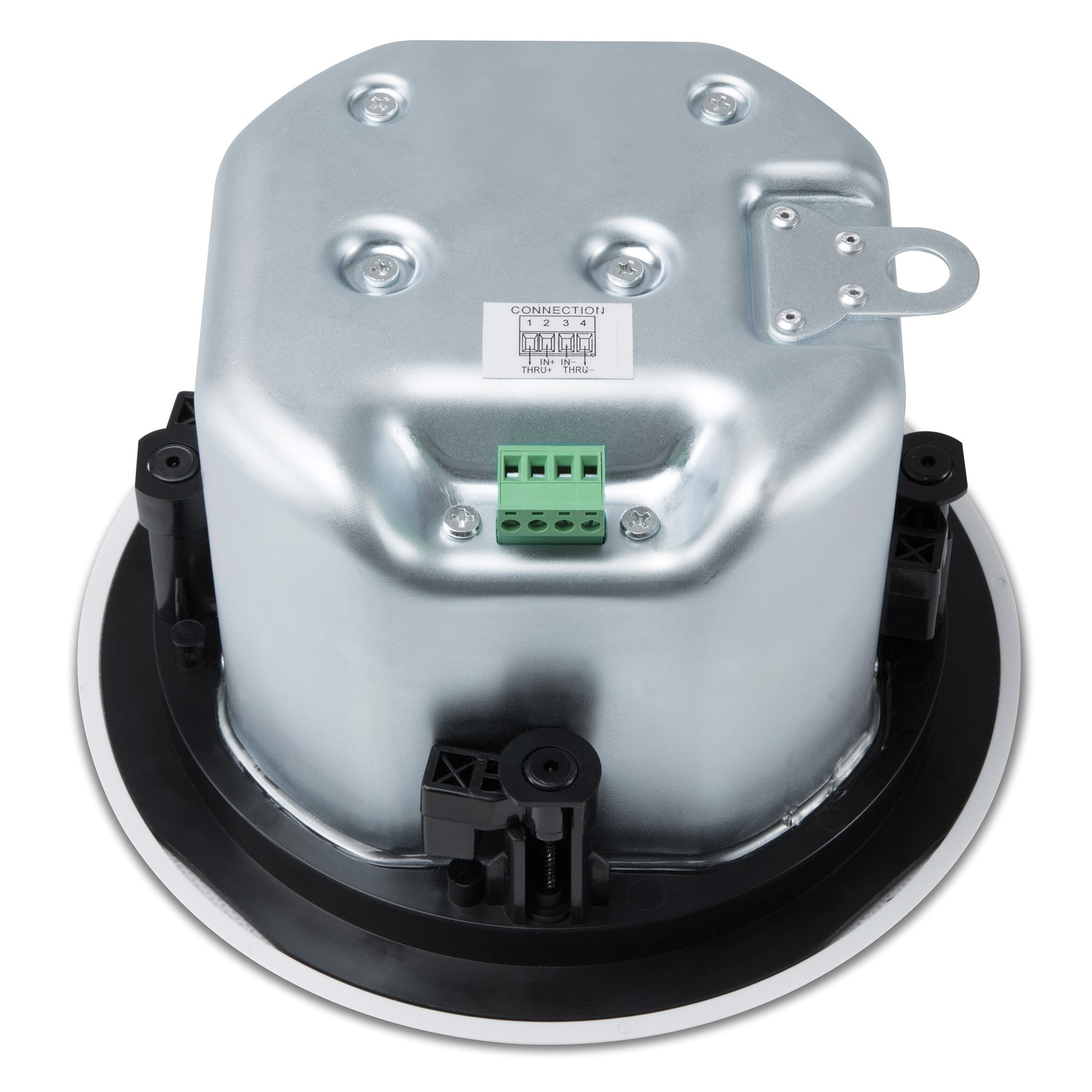 The Denon Professional DN-104S features a metal “can” rear enclosure, which provides a fire barrier behind the speaker to meet commercial fire codes. It also serves as the woofer’s enclosure to optimize its bass tuning and low frequency response. The speakers have 70/100-volt transformers to facilitate multiple unit installations without the impedance and level-matching concerns of paralleled transformerless speakers.