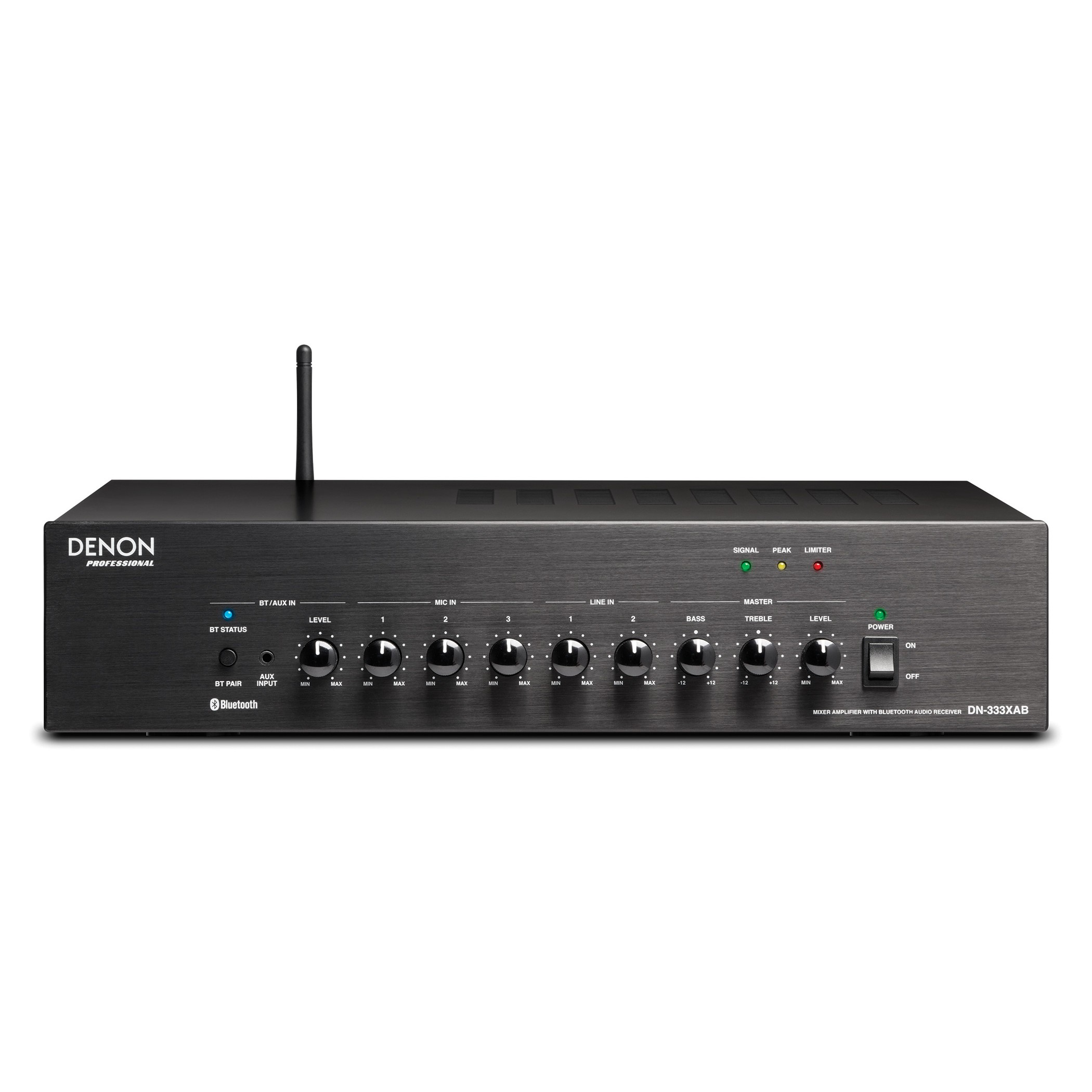 Perfect for driving in-ceiling or wall-mounted speaker systems, the DN-333XAB features 120 watts of built-in Class D amplification at ultra-low distortion for exceptional clarity. Dedicated mixing controls for three XLR+1/4-inch combination microphone inputs, two pairs of stereo line level RCA jack inputs, and a front-panel 1/8-inch (3.5mm) auxiliary input gives users the ability to create a seamless blend of audio from a plethora of source types. A front-panel Bluetooth pairing control with LED status indicator provides a fast and simple wireless connection to smartphones and tablets. A quick-responding limiter eliminates the negative audible effects of excessively high input signals from microphones or playback material.