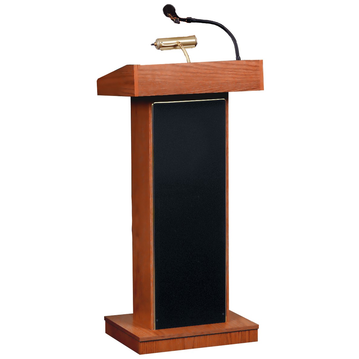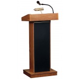 This impressive lectern with has a standard height of 46 inches. Suited to every speaker and environment, the spacious reading surface is illuminated by a brass lamp. Features convenient digital time piece. Four easy roll casters are concealed under an elegant cabinet featuring gold appointments.