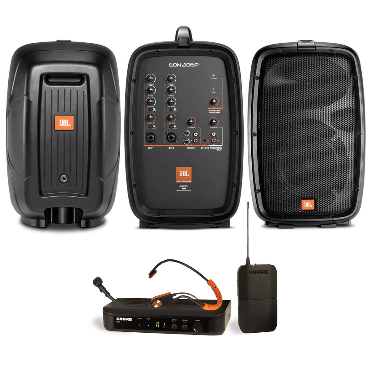 Designed for easy portability, the entire EON 206P system weighs only 25 pounds, features a durable road-tough enclosure, convenient internal cable storage, and comes in a suitcase format for easy transport and storage. It also features a 36 mm pole socket for easy mounting.The Shure BLX14/SM31 Wireless System combines professional-quality sound with simple setup and an intuitive interface for legendary audio performance right out of the box. Precision-built and available in a variety of configurations. The BLX4 Single Channel Receiver features simple setup, intuitive controls, and microprocessor-controlled internal antenna diversity. It includes 1/4" and XLR audio outputs and two-color audio status indicator LED. One-touch QuickScan frequency selection quickly locates the best open frequency in case of interference.