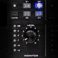 A monitor is built-in for in-room monitoring use with 1 watt/8 ohm output for zone monitoring. The control room can monitor any combinations of zone outputs and has its own level.