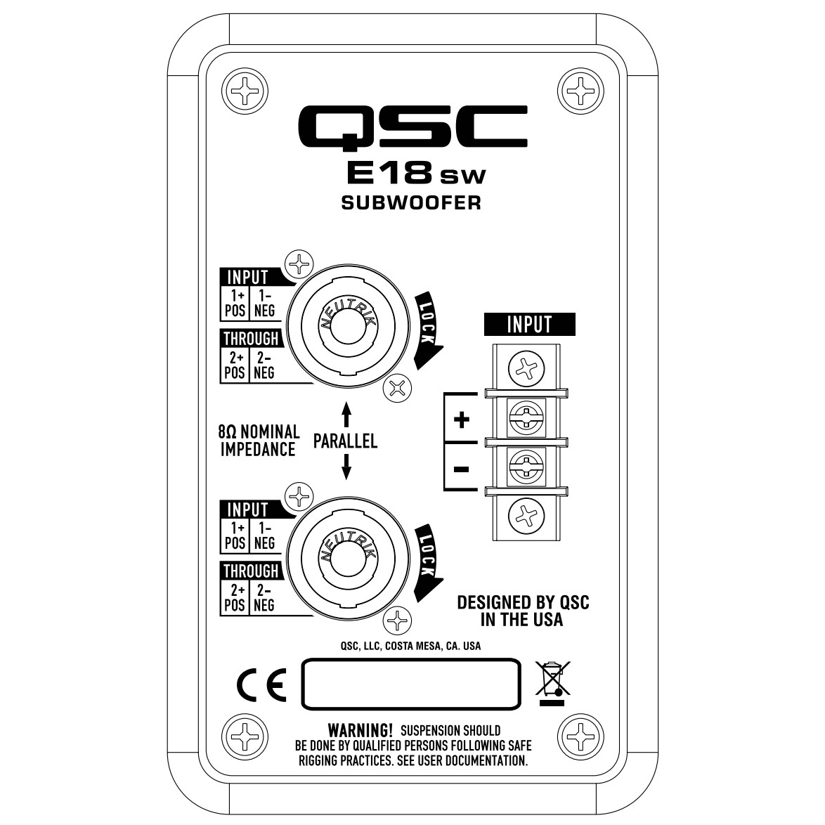 The E18SW is a high-performance direct radiation subwoofer with a single, 800W, 18-inch, aluminum frame woofer. It’s designed to produce crushing low-end for live performance with kick-drum and bass in the PA or for high-level, high-energy dance music. A threaded, M20 pole socket and speaker pole are provided for sub/satellite use with any of the E Series two-way models. For portable applications it includes attachment points for four optional casters. The subwoofer’s 4-ohm impedance means that a single woofer can be optimally powered by a less expensive amplifier.