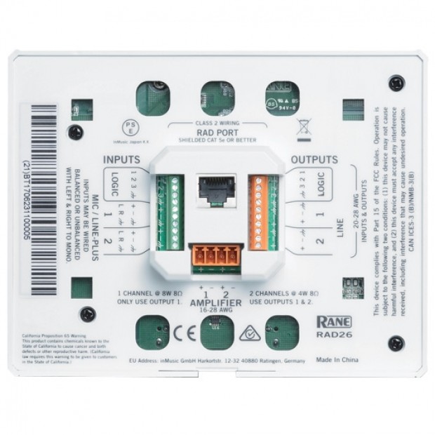 Using one shielded category cable drop, the RAD26 provides any room with a dual 4-watt amp, end-user control via a color custom LCD display & encoders, a dual universal audio I/O interface, plus headphone output and line-level input jacks for local needs. Three logic closure inputs and three active-low outputs add to the control capabilities. The amplifier permits a single channel option at 8 watts into 8 ohms. A RAD26 provides enough I/O and control to support one room in a HAL audio system which may require these features: