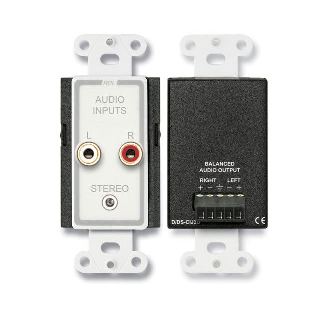 The RDL D-CIJ3D Stereo Consumer Input Jacks are the ideal choice in installations requiring stereo unbalanced line level audio sources to feed stereo balanced (or unbalanced) audio lines. The D-CIJ3D is a complete unbalanced line-level audio input module. The front panel features two gold plated phono jacks and a single stereo mini-jack, intended for mono or stereo consumer level sources. An input signal may be connected to either the phono jacks or to the mini-jack. The inputs are balanced through audio transformers configured to reject induced hum. A stereo line-level output is provided on the rear-panel detachable terminal block for connection to 10 kΩ or higher input impedance line-level module or equipment inputs.- Features