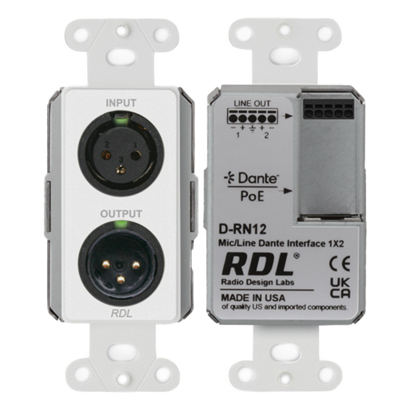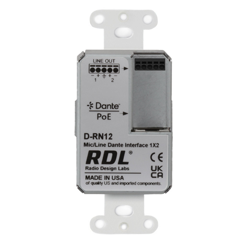 Built for reliability, the D-RN12 delivers high-resolution 24-bit analog-to-digital and digital-to-analog conversion with RDL's legendary low-noise performance. The white Decora-style faceplate blends cleanly into modern environments, while PoE power simplifies installation by eliminating the need for local power supplies. Designed and manufactured in the U.S.A., the D-RN12 is ideal for classrooms, conference rooms, and commercial AV systems requiring flexible, high-quality networked audio distribution.