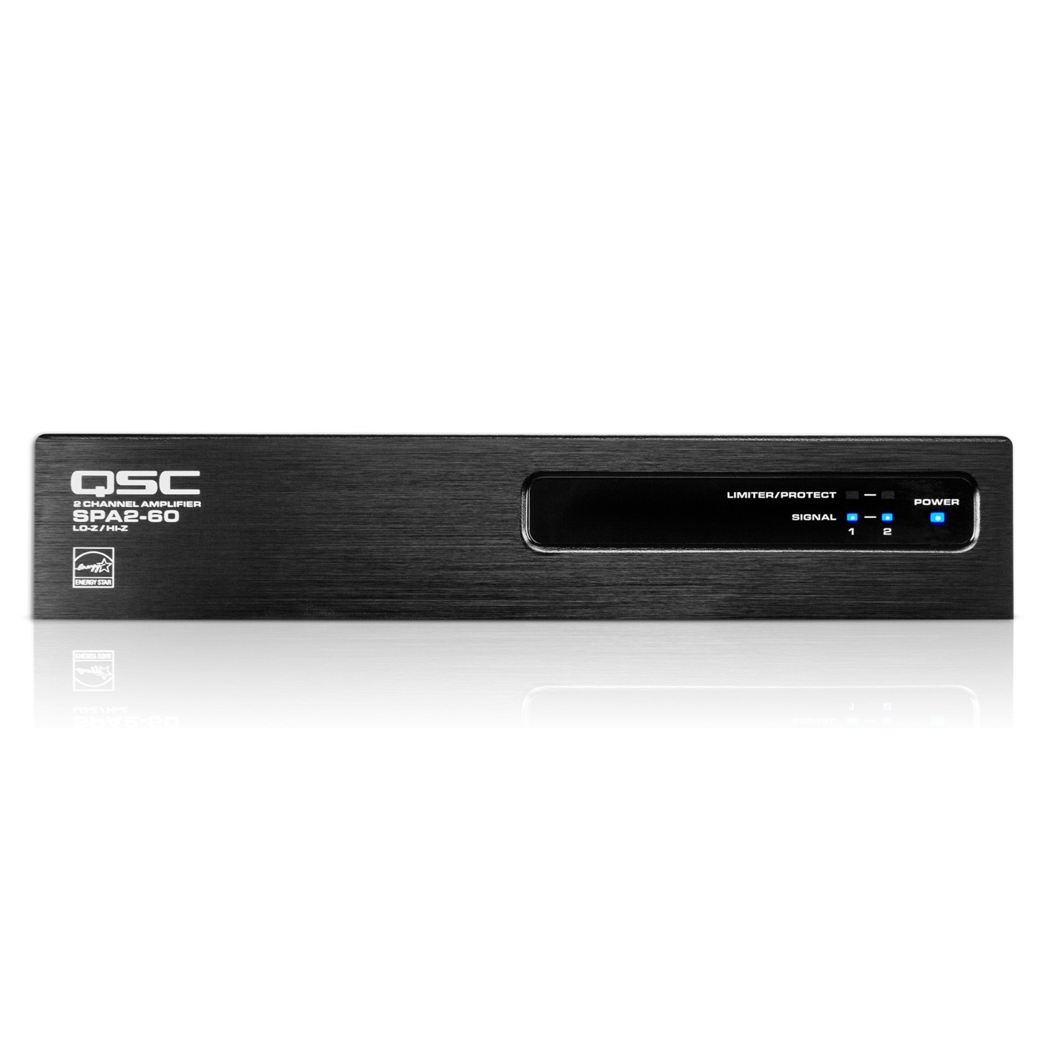 The QSC SPA2-60 two channel amplifier delivers 60W rms per channel into 4 or 8Ω; the two channels can also be bridged providing up to 200W rms into 4 or 8Ω. When the channels are bridged they can be switched into 70V or 100V direct drive mode providing up to 250W rms into a mono 70V or 100V output. There is also an 80Hz highpass filter for bridged operation ensuring that 70V or 100V loudspeakers transformers are not overdriven and saturated by too much low frequency content. The SPA2-60 is ideal for stereo or mono applications of voice or music audio content.