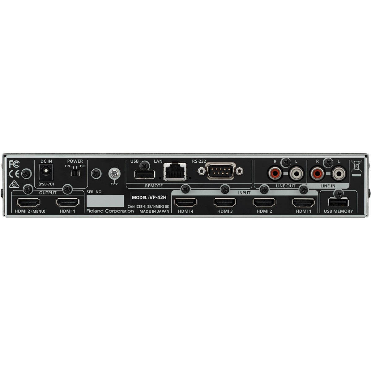 The Roland VP-42H includes stereo RCA outputs for de-embedding audio from connected HDMI sources and outputting it to other devices such as speakers and mixers. Levels for each source can be set by the internal audio mixer, and if the VP-42H is being used as a compositor for recording or streaming, the audio from an external mixer or other sources can be connected to the RCA inputs and embedded into the HDMI output signal.