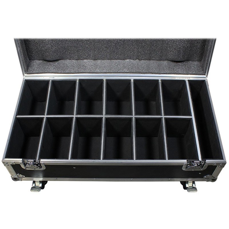 The interior of the case securely holds any combination of up to 12 HotBox brand LED par fixtures with its soft, durable interior foam material and closed-cell foam construction. There's also an oversized padded accessory compartment to hold any extra accessories you like!