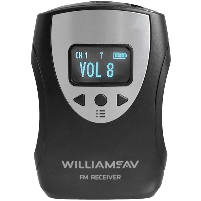 The FM R38 is a multi-channel FM receiver designed for tours, presentations, classrooms, and assistive listening applications. It features a high-resolution OLED display that provides clear visibility of receiver status and allows quick, easy access to all user settings. With 17 pre-set wide-band frequencies (72-76 MHz), the FM R38 ensures reliable operation with all compatible Williams AV transmitters.