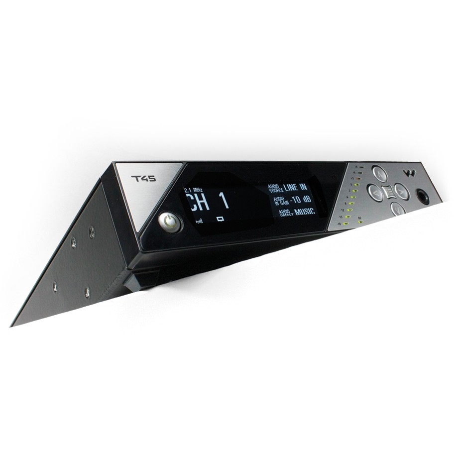 Storage: -4° F to +158° F (-20° C to 70° C)Menu Settings Audio Presets (Music, Voice, Hearing Assist, Custom), Frequency/Channel selection, Frequency/Channel mode, Audio Input Source (Microphone, Line, Phantom, Digital AES/EB, Digital S/PDIF), High Pass Filter, Low Pass Filter, Compression, RF Output Power, Screen Saver Delay, Test Tone (400 Hz), Headphone Volume, Headphone Source, Ethernet/Network Settings (PPA T45 NET and PPA T45 NET D) Operating Frequencies 72.1-75.9 MHz , 17 wideband channels (selectable) Compatible Antennas ANT 005, ANT 021, ANT 024, or ANT 025 Transmission Range Up to 1000 ft (304 m) with ANT 005 coaxial antenna mounted on rear chassis connector RF Timer Menu selectable - 30 Min, 4 Hours, or Always On. Timer starts when no audio is present RF Power Menu selectable - High, Medium, Low, OFF RF Outputs (1x) #10-32 stud connector in center of unit (pcb mounted)